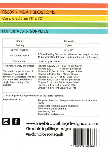 Indah Blossoms Quilt uses applique to create a vibrant quilt from solid or patterned fabrics. Pattern includes instructions for raw edge & needle turn applique. Designed by Carolyn Murfitt of Freebird Quilting Designs