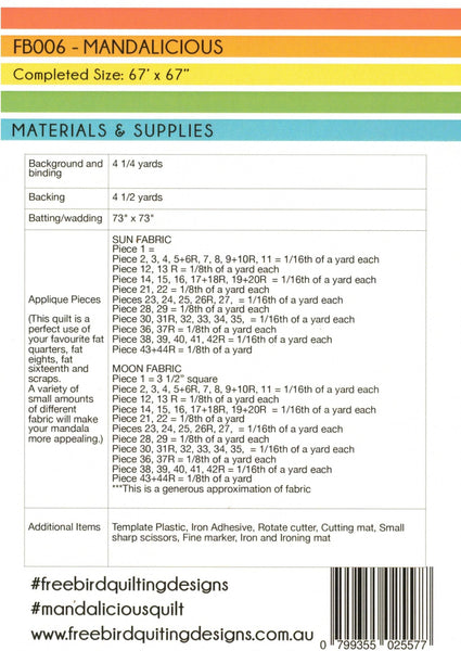 Mandalicious Quilt uses applique to create a vibrant quilt from solid or patterned fabrics. Pattern includes instructions for raw edge & needle turn applique. Designed by Carolyn Murfitt of Freebird Quilting Designs
