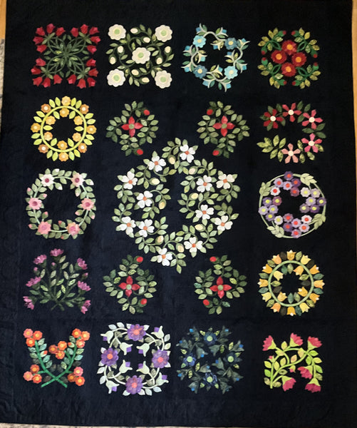 Block 7 Tulip and Posy Wonky Wreath. Designed by Arelle Designs Batik Fabrics Online, single block from Bindy's Bali Baltimore Sampler Quilt. It is a modern Baltimore Style Queen Size Topper 90" x 74" using Machine Blanket Stitch Applique. Very dark Navy Blue batik background sets off the stunning applique designs using batik cottons. Designed as a sampler quilt with a large center panel surrounded by 14 individual blocks. Colour choices are only limited by your imagination. Patterns are full size, ready to be copied and traced. Basic fusible applique instructions included for each block. Single Block instructions do not include yardage and instructions for the entire quilt. The single block can be used as a cushion pattern with a border.
