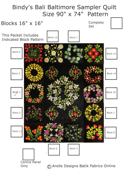 KP1BBB-4 Block 4 Posy Bud Wreath 16" x 16" Block of Bindy's Bali Baltimore Sampler Quilt Pattern 90" x 74" Designed by Arelle Designs Batik Fabrics Online, single block from Bindy's Bali Baltimore Sampler Quilt. It is a modern Baltimore Style Queen Size Topper 90" x 74" using Machine Blanket Stitch Applique. Very dark Navy Blue batik background sets off the stunning applique designs using batik cottons.  Designed as a sampler quilt with a large center panel surrounded by 14 individual blocks. Colour choices are only limited by your imagination. Patterns are full size, ready to be copied and traced. Basic fusible applique instructions included for each block. Single Block instructions do not include yardage and instructions for the entire quilt. The single block can be used as a cushion pattern with a border.